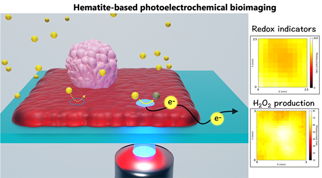 東北大学学際科学フロンティア研究所の阿部博弥准教授らの研究グループは、同大学工学研究科、医工学研究科、東京科学大学、東京理科大学、University of Electronic Science and Technology of China (中国)、The Chinese University of Hong Kong, Shenzhen (中国)との共同研究により、ヘマタイト(酸化鉄)を用いた光アドレス電極による新しい光電気化学バイオイメージング手法を提案し、腫瘍スフェロイド周辺に形成されるH2O2濃度勾配を可視化できることを示しました。本研究は、光合成のように「光を使って化学反応を動かす」という発想をヒントに、光で電気化学信号を生み出して化学情報を可視化する手法です。本手法は、可視光照射によって電極上にファラデー電流(光電流)を局所的に発生させ、その信号強度と照射位置の関係から化学情報をマッピングします。また、電極作製にフォトリソグラフィ等の複雑なプロセスを必要とせず、比較的簡便な製造工程で実現できる点も特長です。